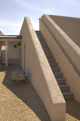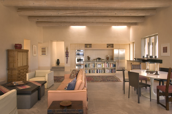 Located in northwest Santa Fe, this house sits on high ground with sweeping sunset views of the Jemez Mountains across the Rio Grande Valley to the west and breathtaking views to the Sangre de Cristo Mountains to the northeast.
