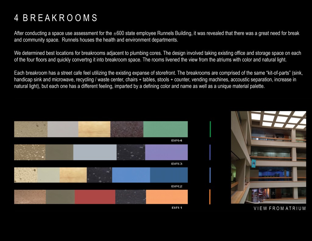 After conducting a space use assessment for the ± 600 square foot state employee runnels building, it was revealed that there was a great need for a break and community space. Runnels is comprised of the Health and Environment Department.