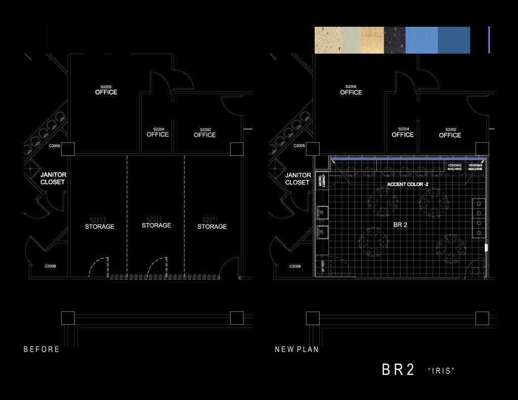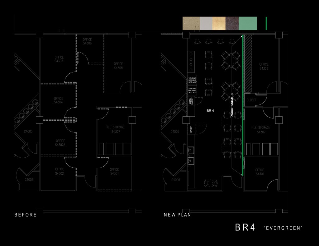 We determined best locations for breakrooms adjacent to plumbing cores. The design involved taking existing office and storage space on each