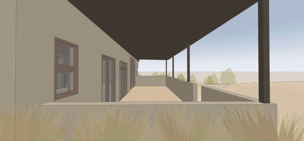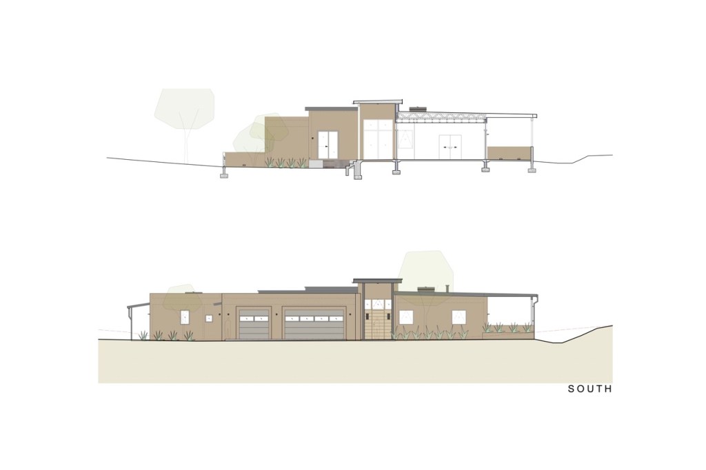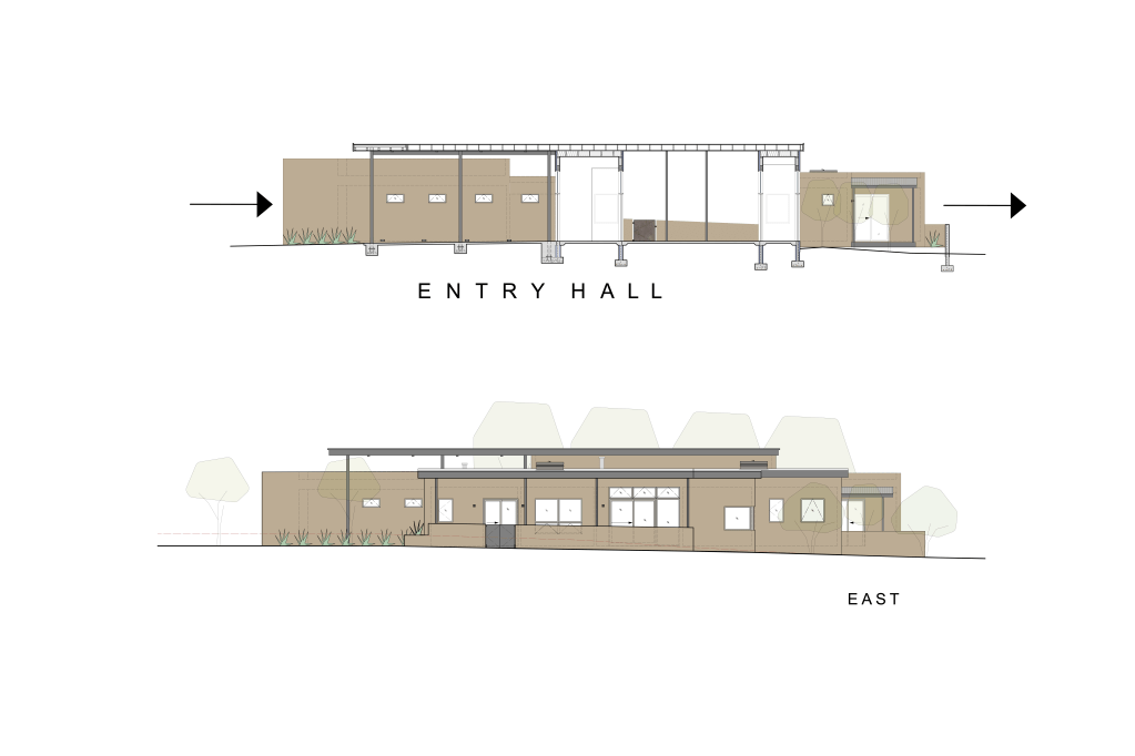 The ascending site approach introduces the visitor with low colored concrete walls, steel plate, and gabion baskets to mitigate the natural drainage / arroyo – one discovers the view of the house and views along this sequence.