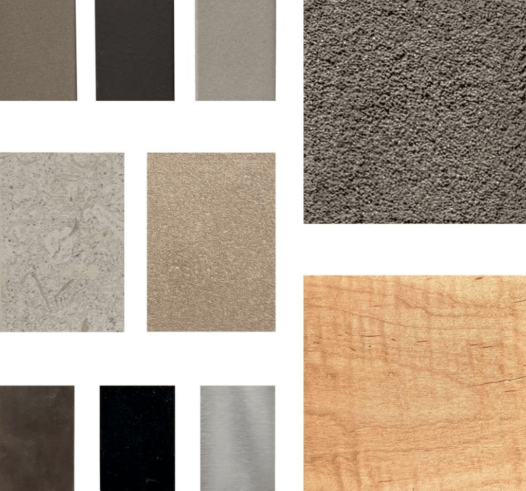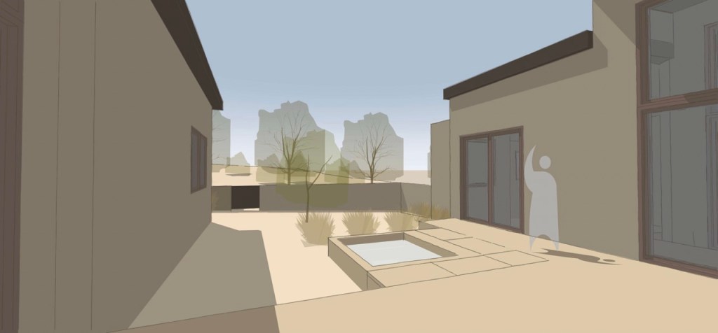 The Pinwheel design revolves around the Central Courtyard that features a Porch, Spa Tub, and Deciduous Trees. The Central Entry Hall carries a Floating Roof element with expansive windows to create a vista through an Aspen grove and the natural landscape beyond. The East Porch incorporates an extension of the Kitchen / Living with a BBQ and generous lounging areas. A low colored concrete wall frames the view of the Mountains.