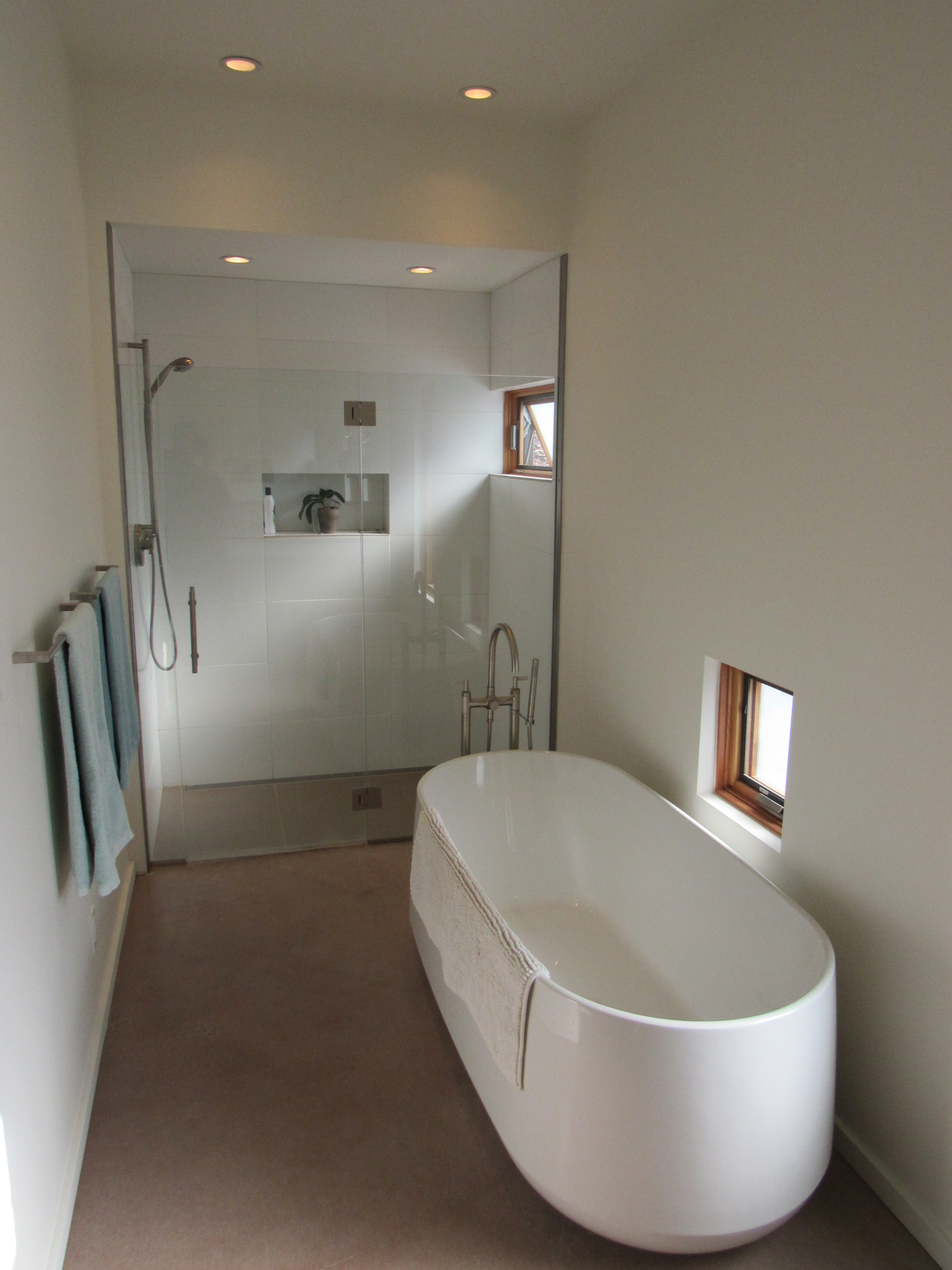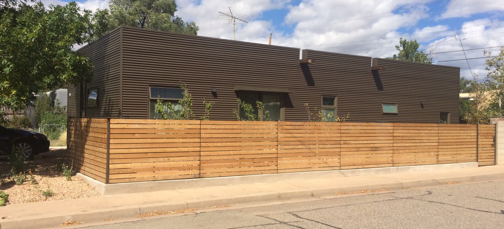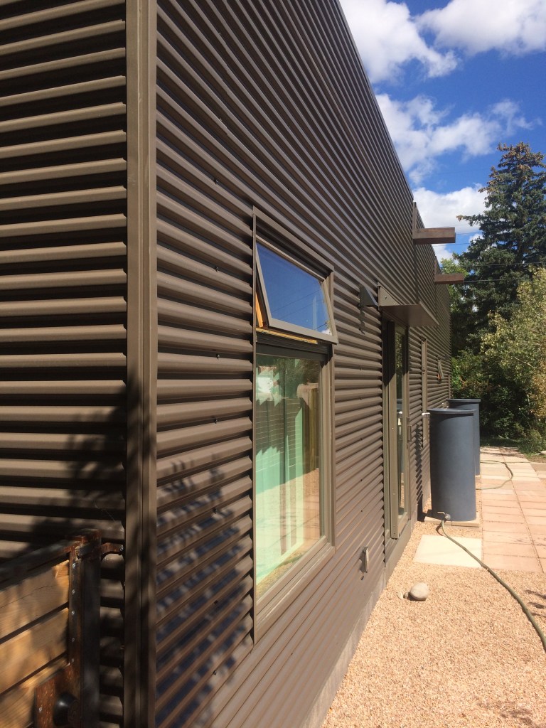 Warm grey stucco and dark brown corrugated metal siding, matching window cladding, steel features, colored concrete. Use of birch, poplar, maple woods, fir windows, western cedar and steel fence and gates. Pre-fab and custom cabinetry. Rain water collection and passive solar techniques utilized.
