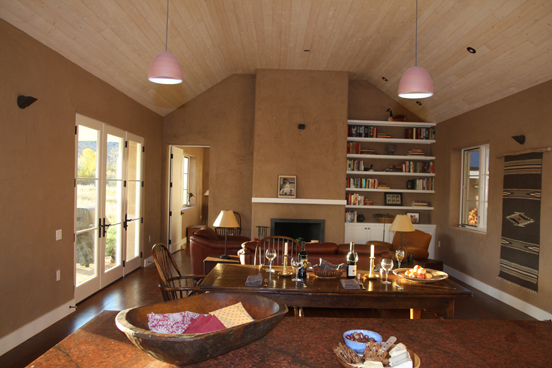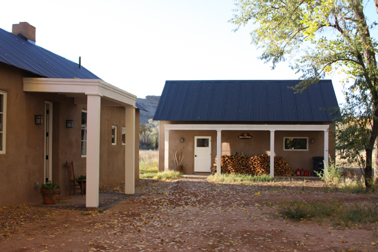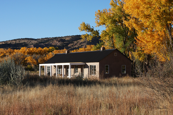 The Abiquiu House embodies the spirit of old Hispanic adobe houses of the region. The simple corrugated steel gable roof, single line of rooms, thick masonry walls, long porch, mud plaster interior and white woodwork all reflect traditional houses of the Chama River valley.