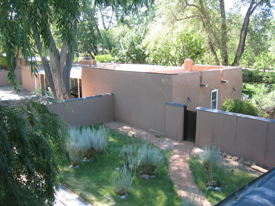 The project included restoring all wood windows and door openings, and repainting to match the original color palette. Connective pathways, gates, grasses, and bamboo stripe were provided, along with extending the bedroom tumbled brick patio. A new kitchen, kiva fireplaces, heating upgrades, and extensive shelving were also included.