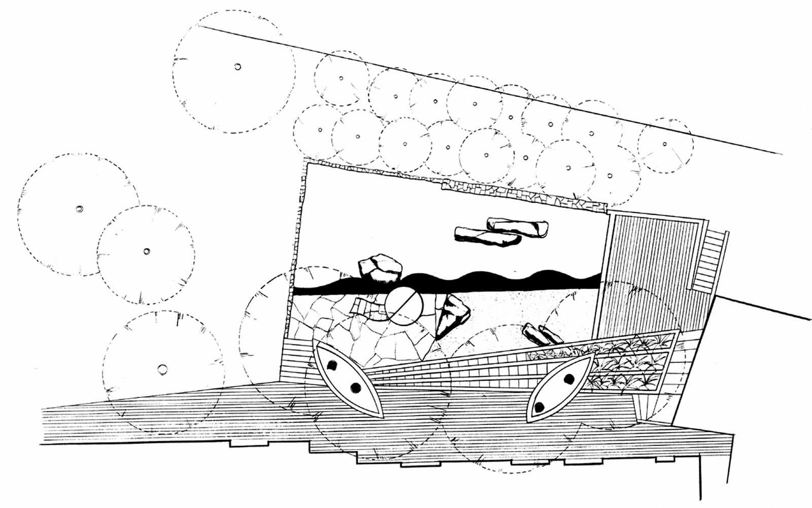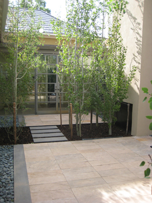 A Zen garden was designed to provide the needed tranquility. The simple inorganic material became a foil to the dense surrounding growth.