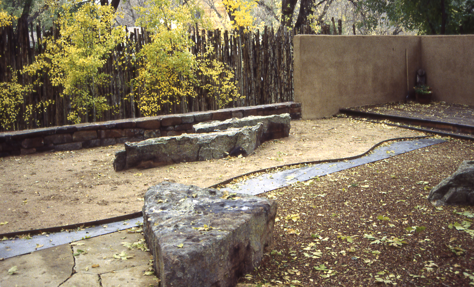 The Block / Drucker garden takes its form from the perimeter of a filled-in concrete swimming pool situated on the site. Mature elms, various outbuildings, and retaining walls dominate the site, which lies low in the lush landscape along Tesuque Creek.